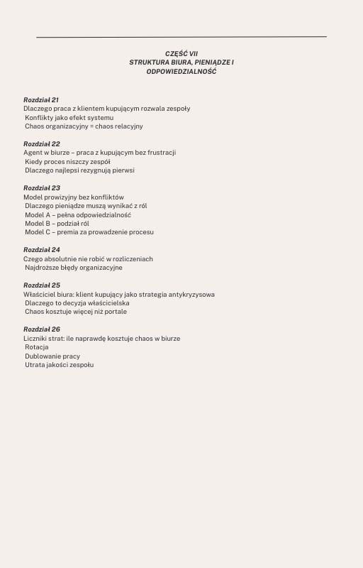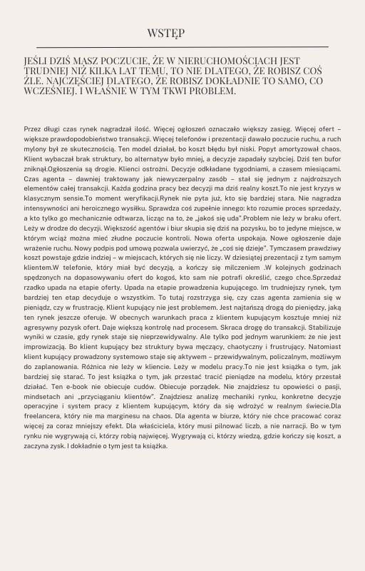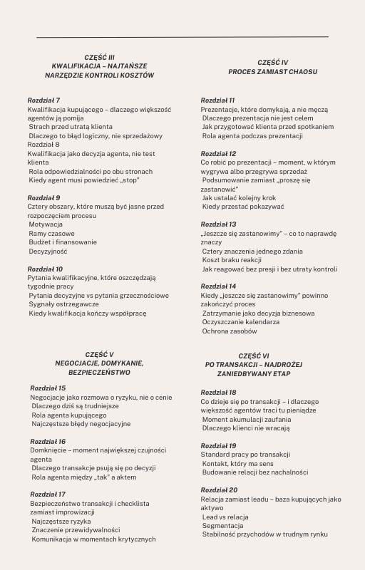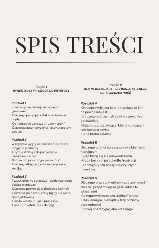 Każdy rozdział to praktyczny insight, który możesz wdrożyć od razu — bez teorii oderwanej od realiów rynku nieruchomości.